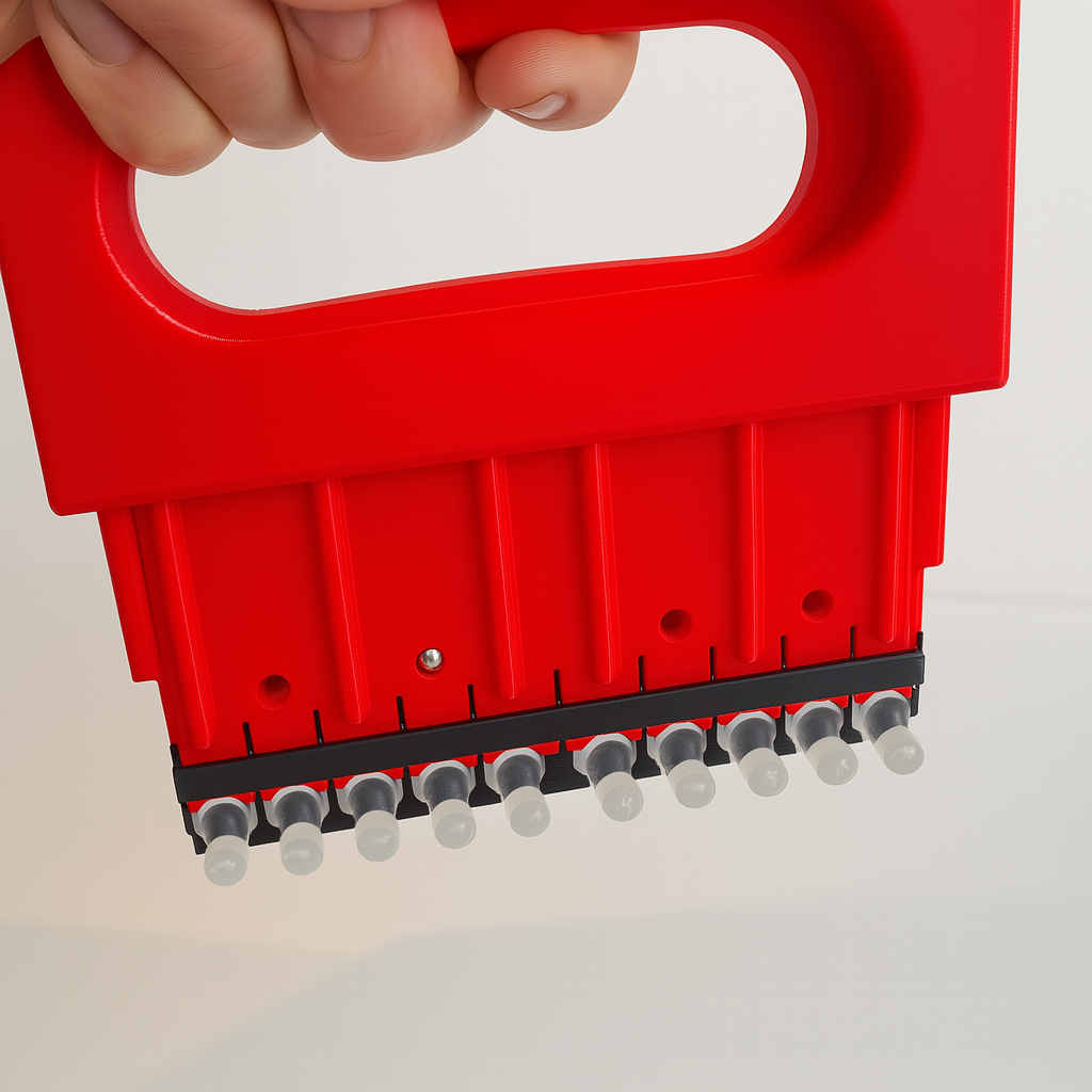 Voor het efficiënt plaatsen van de oordoppen in printmallen ontwikkelden we een gripper, waardoor de mallen veel sneller en met minimale inspanning gevuld kunnen worden.